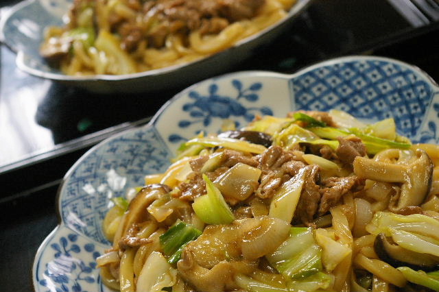 たまには、うどん焼きです。きゃべつやたまねぎ、しいたけなどの具沢山。お野菜におうどんが埋もれています(*^_^*)
