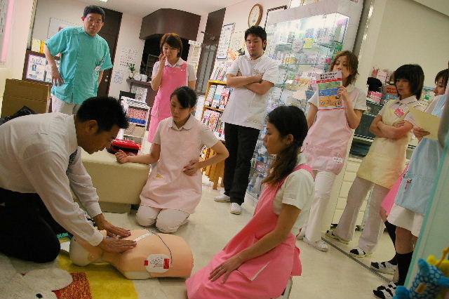 「心臓を挟んでパッドをつけてください。」「子供は胸と背中です。」と指導。スタッフから、次々質問が。。。