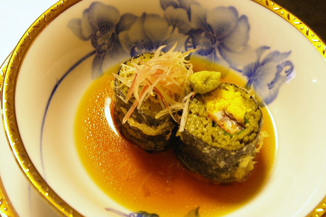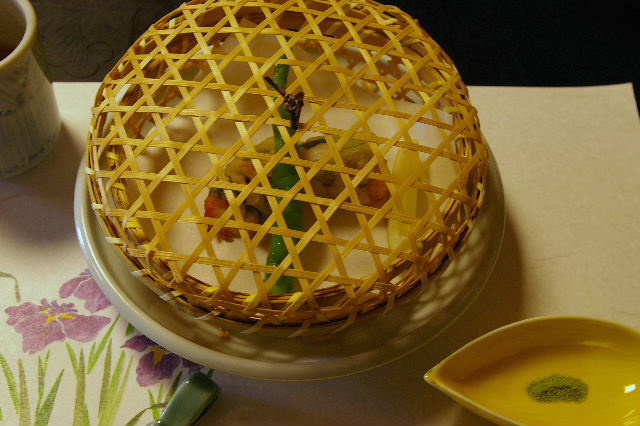 油物 こんな風に竹籠で出てくると、日本人で良かった〜なんて思える瞬間ですね♪中の胡麻豆腐がふわりと溶け出して美味。