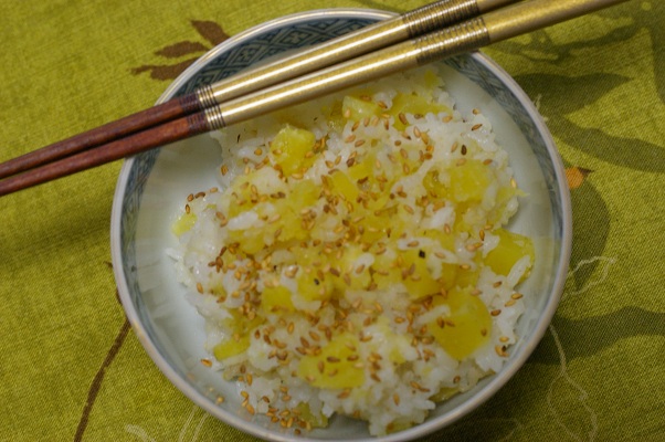 さっそく、昨日の夕食のご飯は、秋の香りの『さつまいもご飯』なり♪